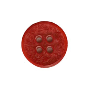 Textured top red button with four holes and slight concave top.