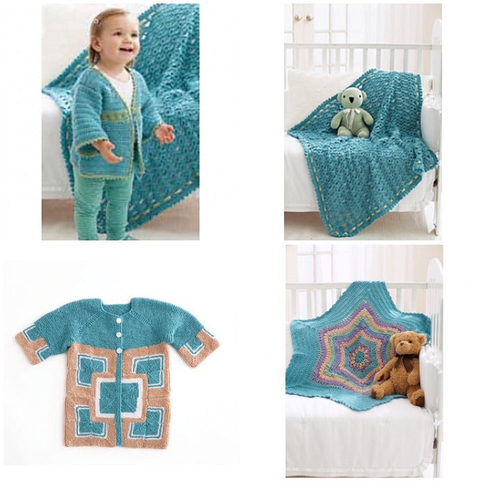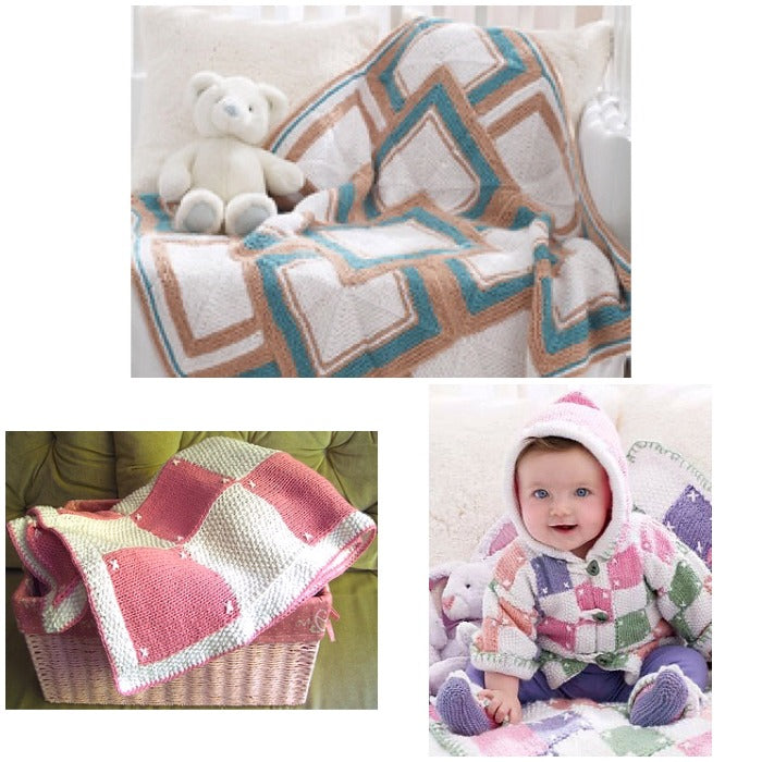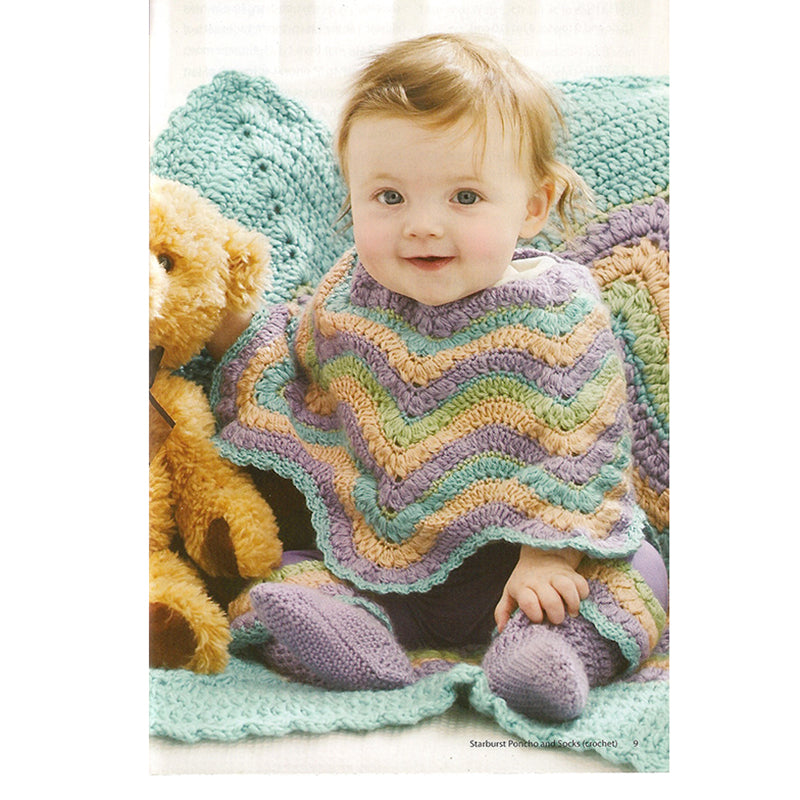 Worked with Baby Chunky or sport yarn. Crocheted baby poncho and matching afghan with booties, or knit a blanket in garter stitch and jacket and booties in mitered blocks.