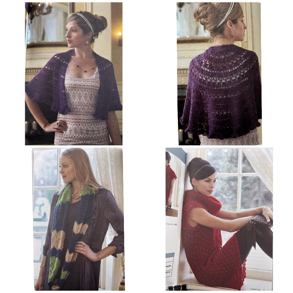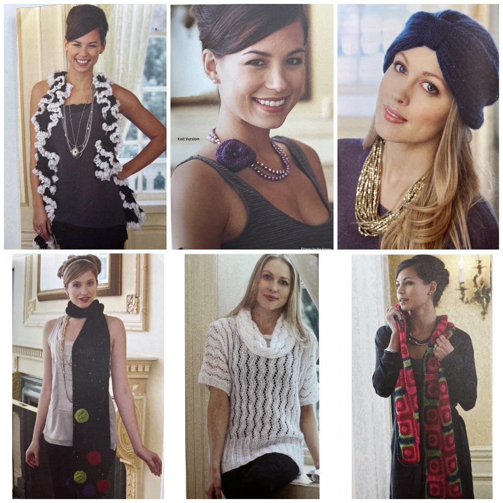 Designs: knitted lacy cowl neck tunic, lace shawl, knitted 3 color chevron scarf, crocheted log cabin scarf, knitted lacy tunic with sewn in cowl collar, crochet scarf with ruffle edge, scarf with option knit flowers, knit turban