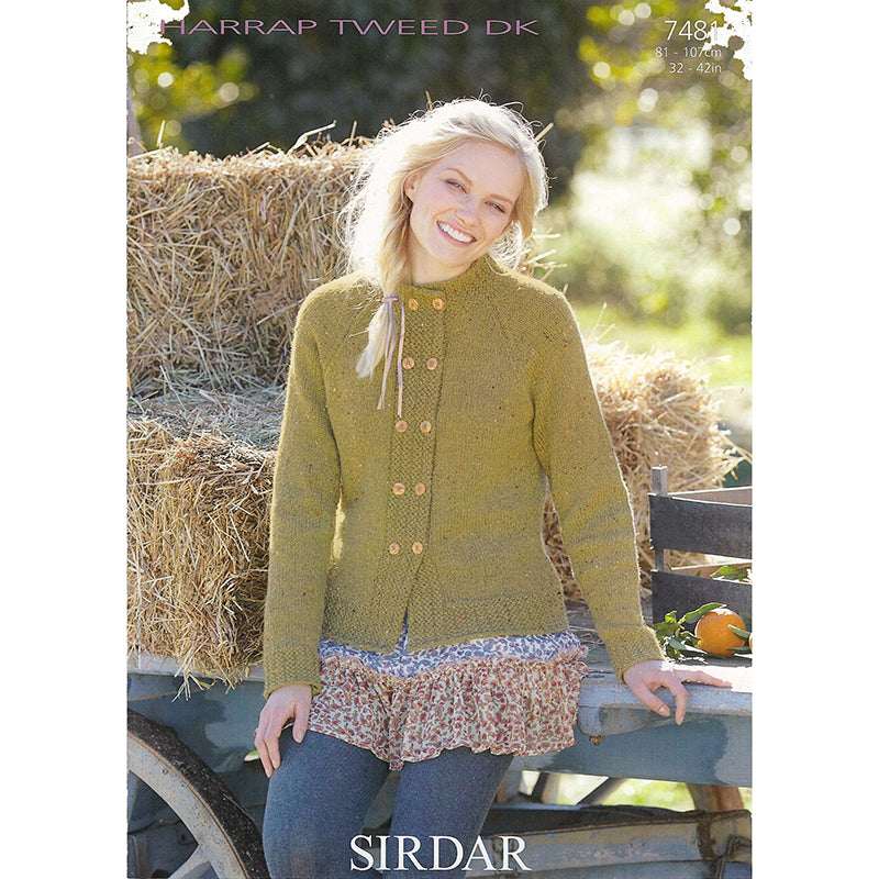 Sirdar 7395 presents Harrap Tweed created a double breasted cardigan with raglan long sleeves. Edges and button bands worked in a textured stitch. Cardigan is finished with a standup collar