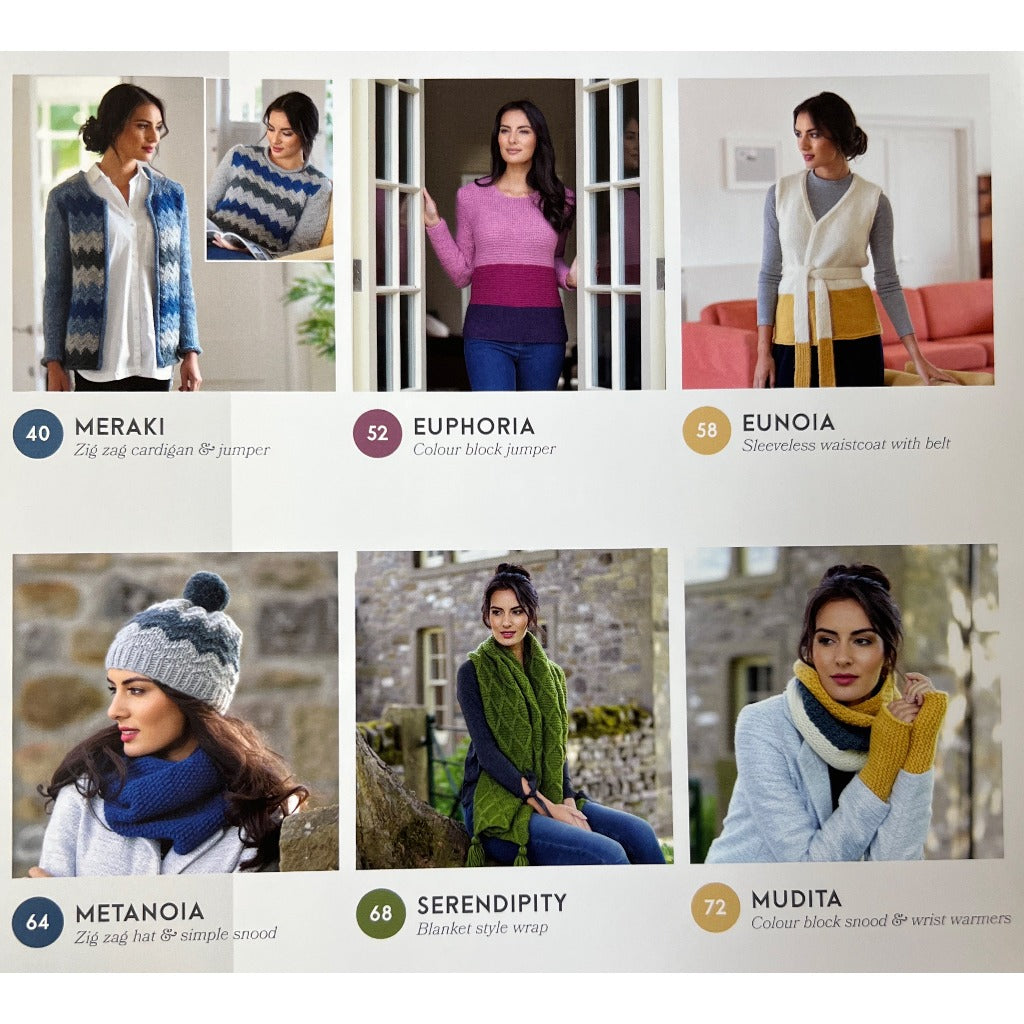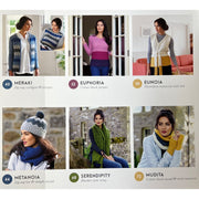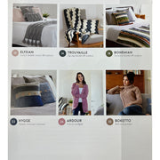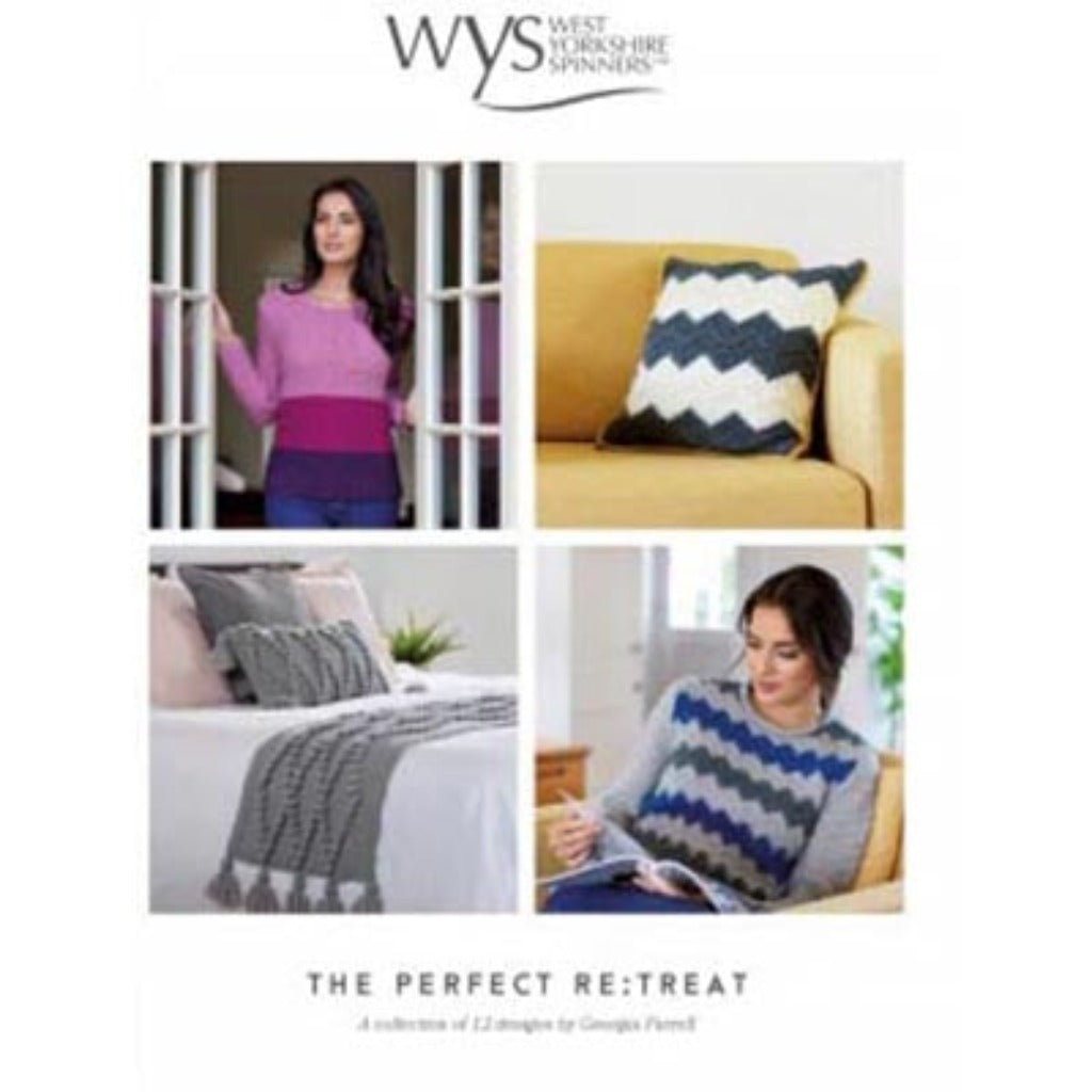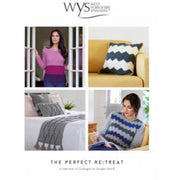 Re:treat. Bobble pillow and afghan, Cabled pillow and afghan, pillow in moss stitch, long cardigan, cardigan, garter stitch sweater, vest, snow caps, scarf, Retreat used in each pieces.