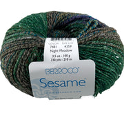 Wool, acrylic, cotton, and nylon come together for a colorful yarn flecked with color and texture.