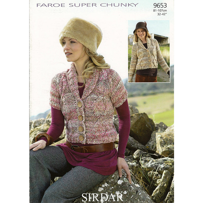 Sirdar - Faroe Super Cunky - Cardigan.Worked in large easy cables with raglan sleeves. Work in long or short sleeves with rolled jacket collar. Four button closure.