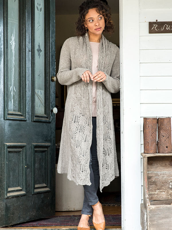 Designed in lace Shawl, v-neck sweater, tunic and duster with lace trim