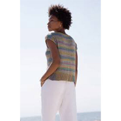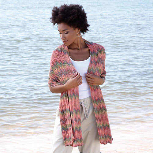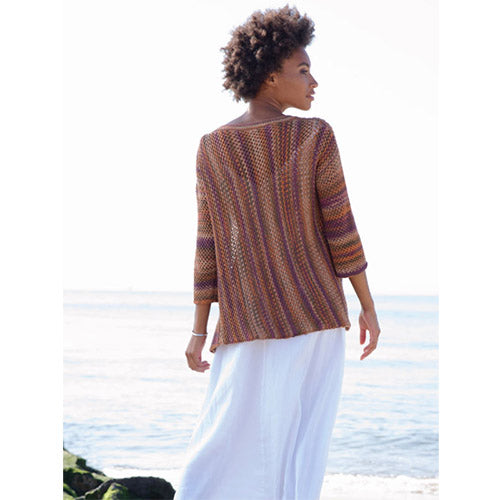 Medina features lacey cardigan shift, garter stitch scarf, crocheted bag with handle, garter stitch shift, wave shawl, sun top