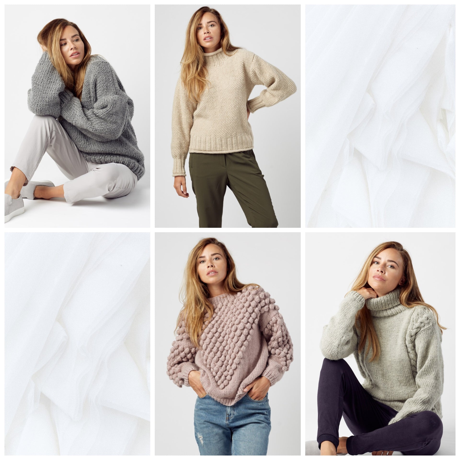 Quail Studios Cocoon collection - 4 hand knit patterns: Cocoon throw on sweater, moss stitch sweater, cabled sweater, bobble sweater  -