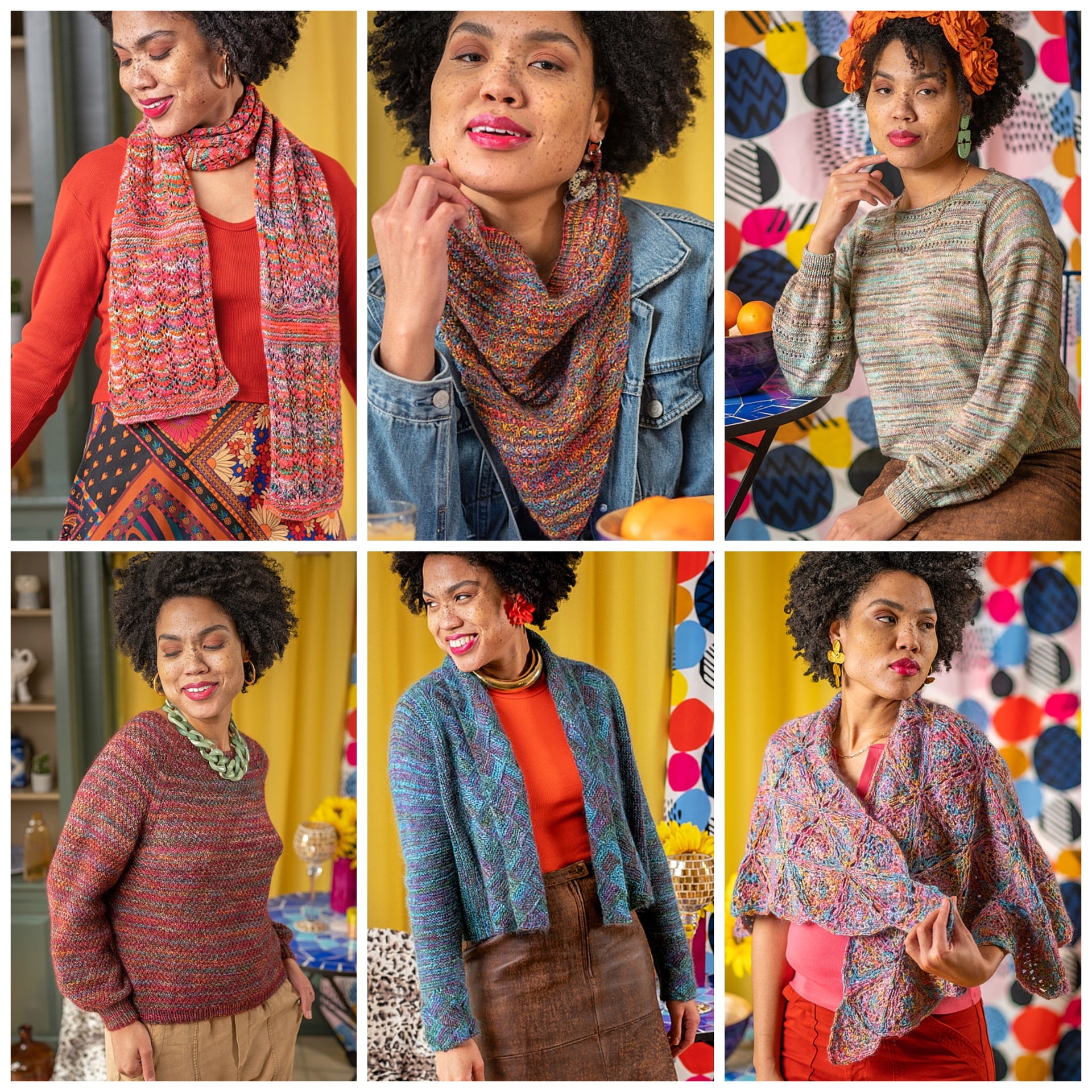 Designs include: Shawl, Sweaters, Jacket, and, Scarves.
