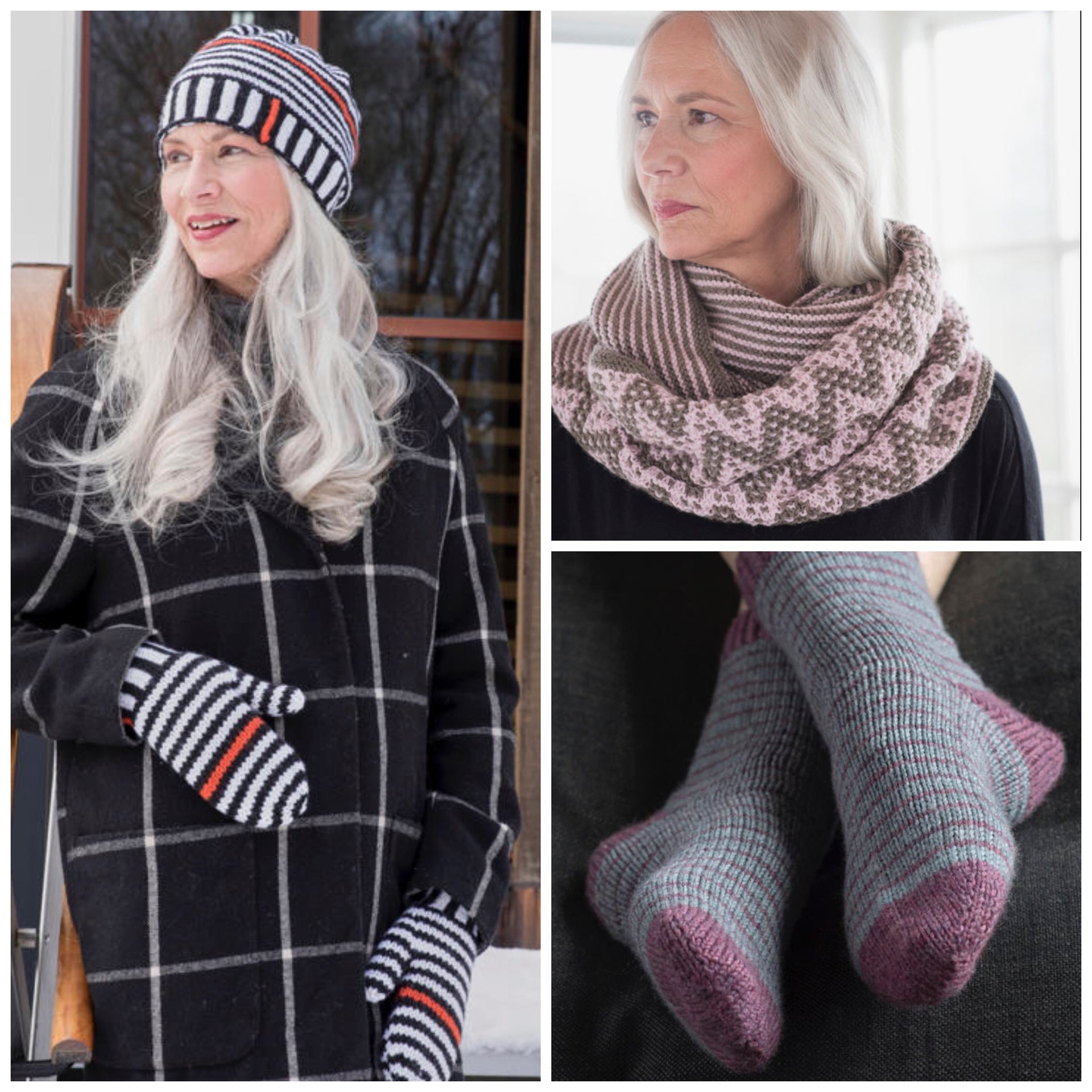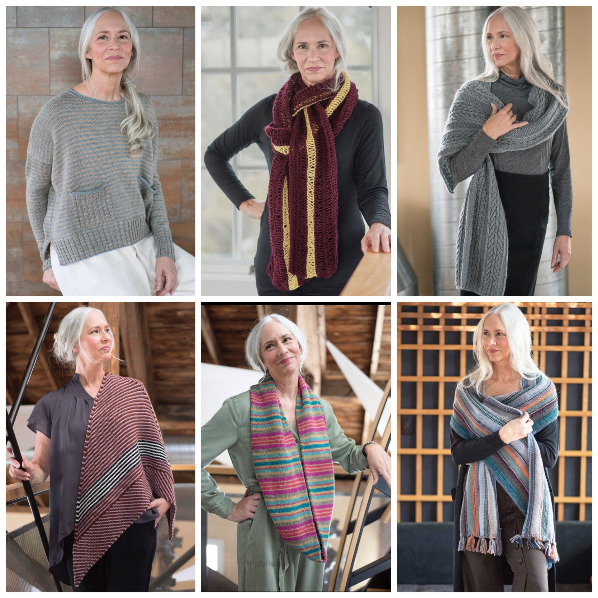 Includes: Striped pocket sweater, cowls, shawls, cardigans, cabled scarf, sweater, hat with mittens, yoke sweater, scarf with wrap-stitch and socks.