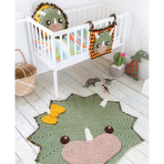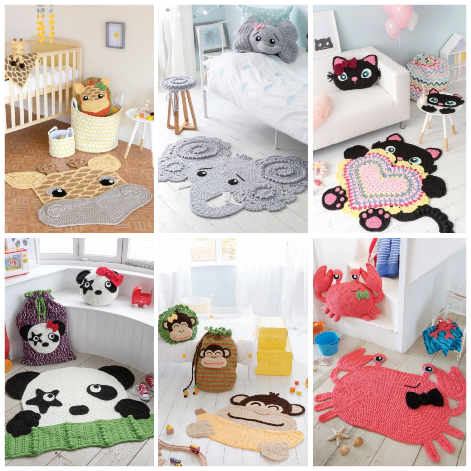 Crochet featuring Jeffery the elephant, Rusty the giraffe, Sassy the kitty cat, Rock’n’Roll the panda, Chip the monkey, Cranky the crab, and Tops the dinosaur.
