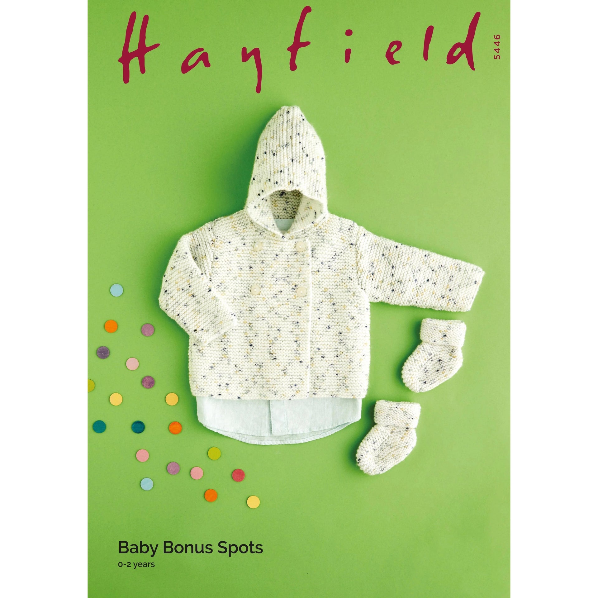 Hayfield 5442 Hayfield Baby Bonus Spots Garter stitch with cardigan with hoodie and cross over closure set in sleeves. bootie pattern included