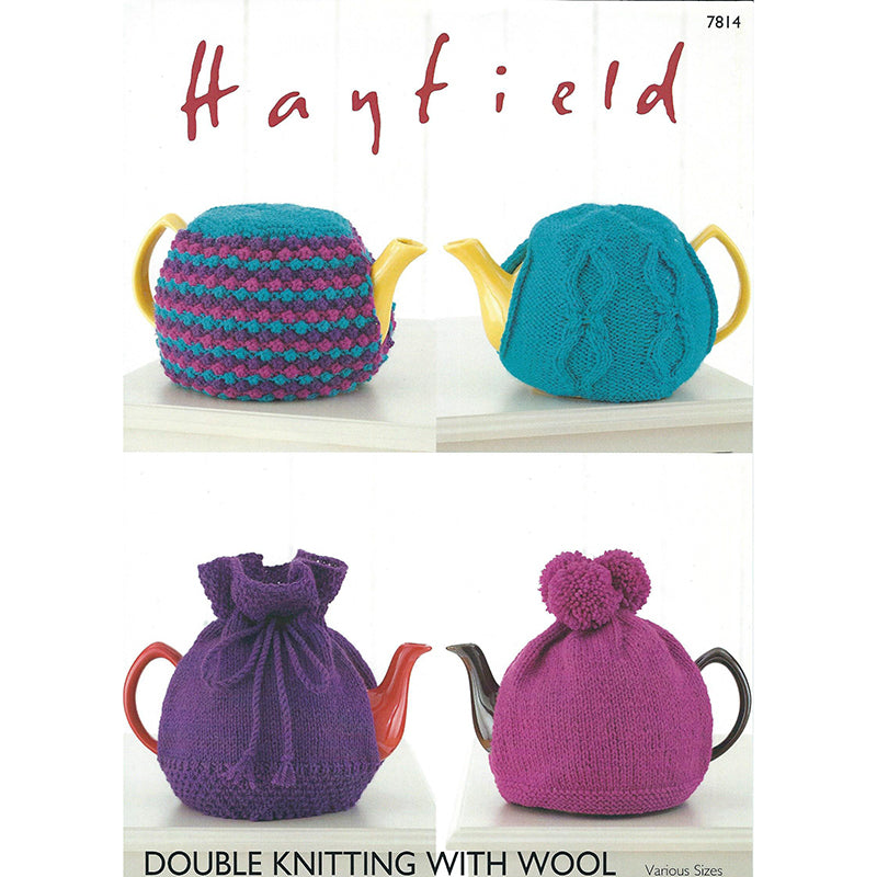 Hayfield leaflet 7814 design Double knitting with Wool to make 4 adorable Tea pot covers. Use stitches such as slip, cable, or plain with unique toppers.