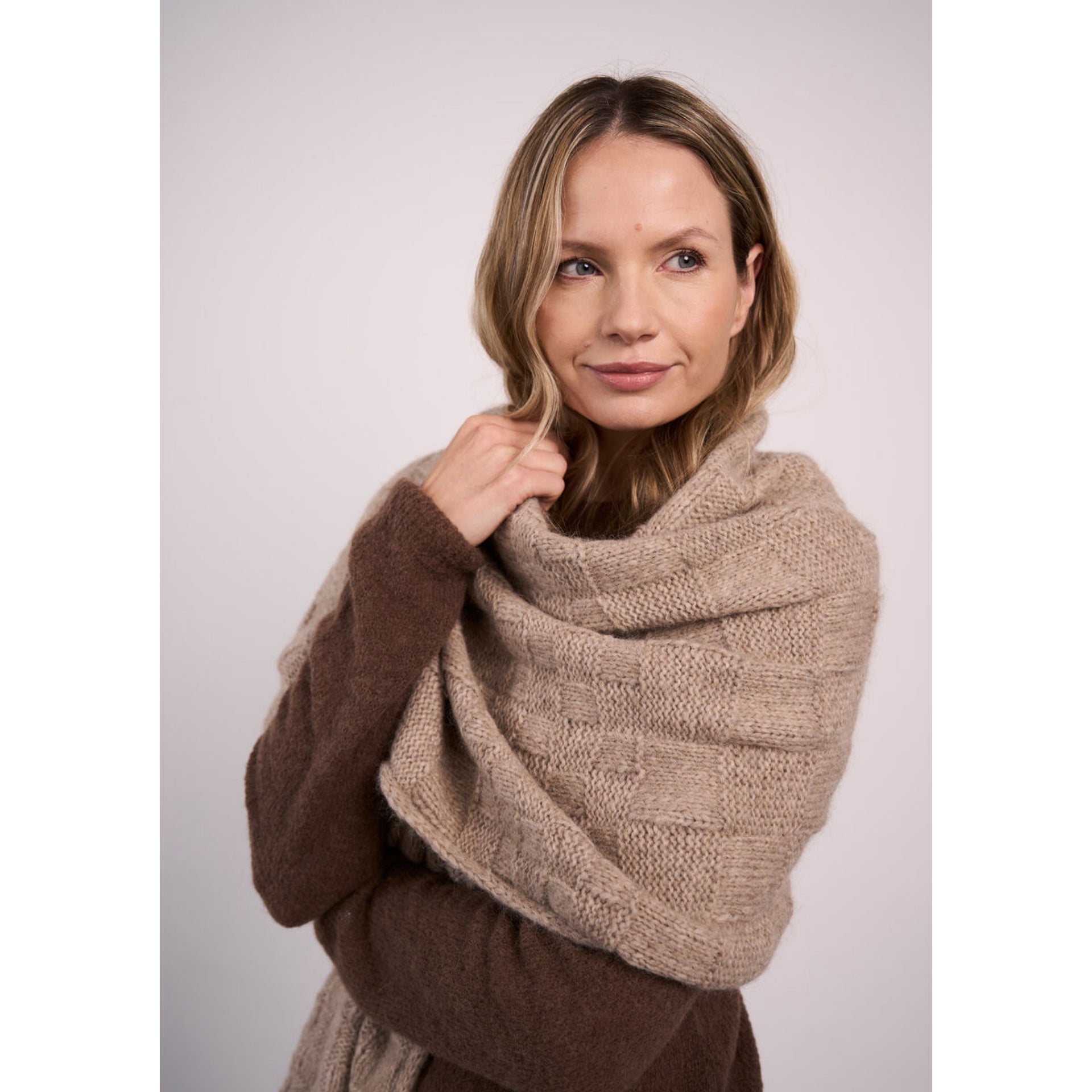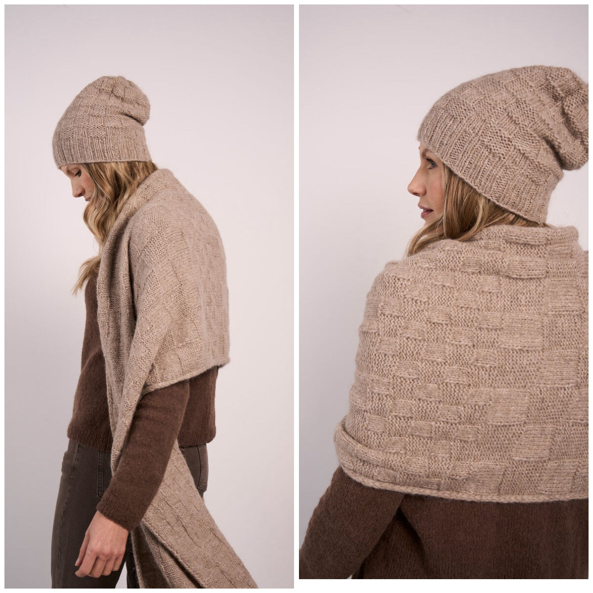 By Georgia Farrell the Heather hat and wrap are worked in Softest Alpaca using a checkerboard style stitch on each to create a lovely matching set.