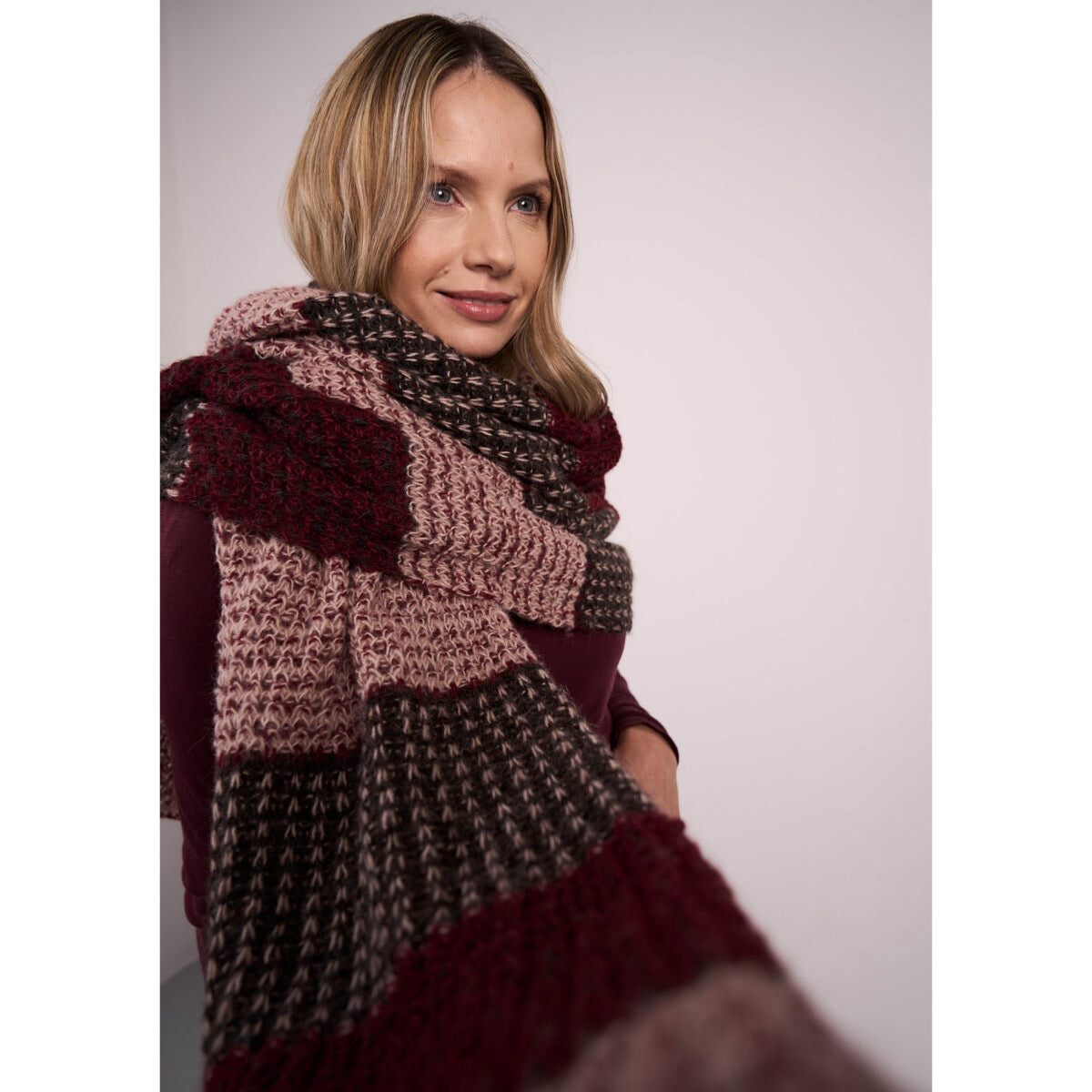 Perry is a stunning striped wrap by Lisa Richardson, featuring luxurious brioche stitch for depth and texture. Knitted in soft Alpaca Cotton, it showcases the deep, rich tones from our seasonal palette, perfect for adding warmth and elegance to any outfit.