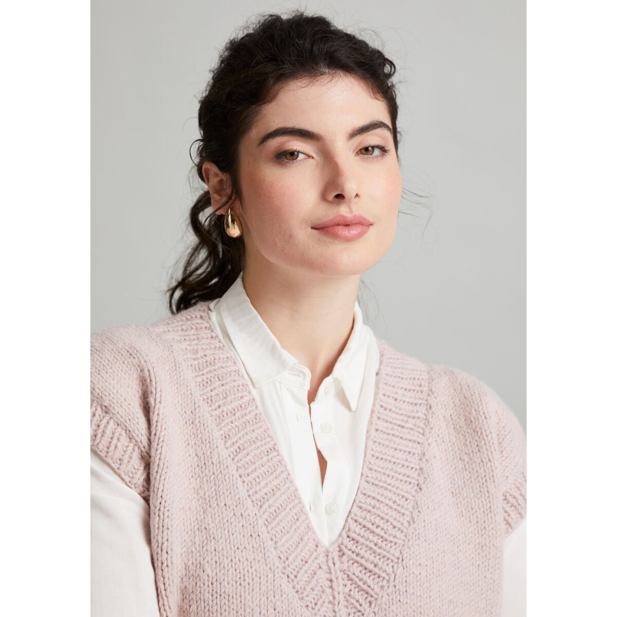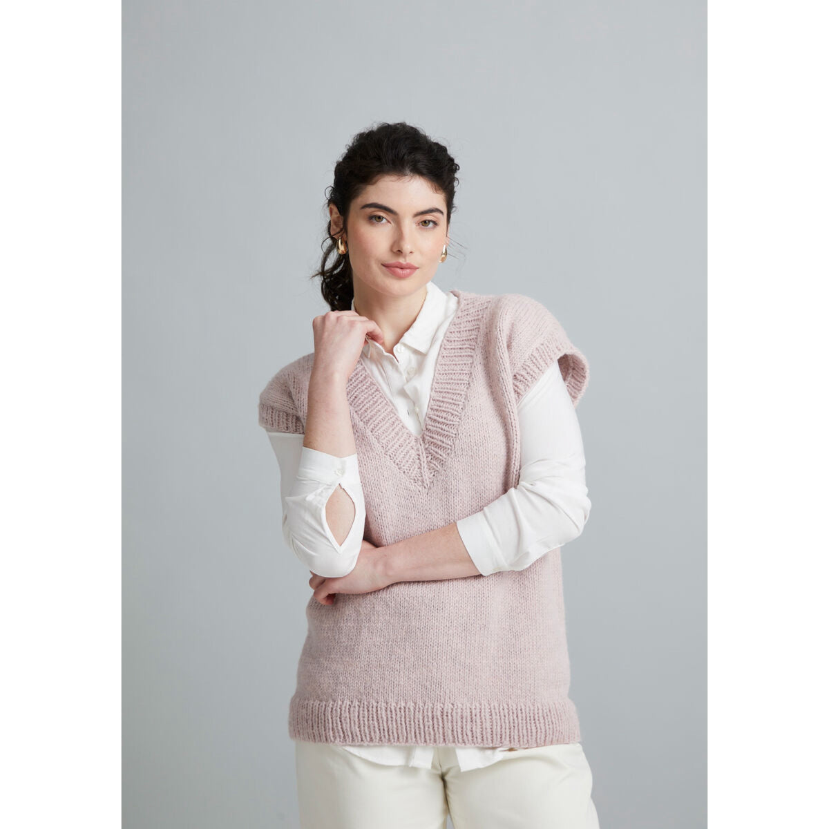 Elwood is a stylish V-neck vest featuring a bold houndstooth effect, crafted in two contrasting shades of soft Alpaca Cotton. Designed with a deep ribbed hem and neckline, it's perfect for layering or wearing on its own as a statement piece.