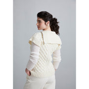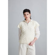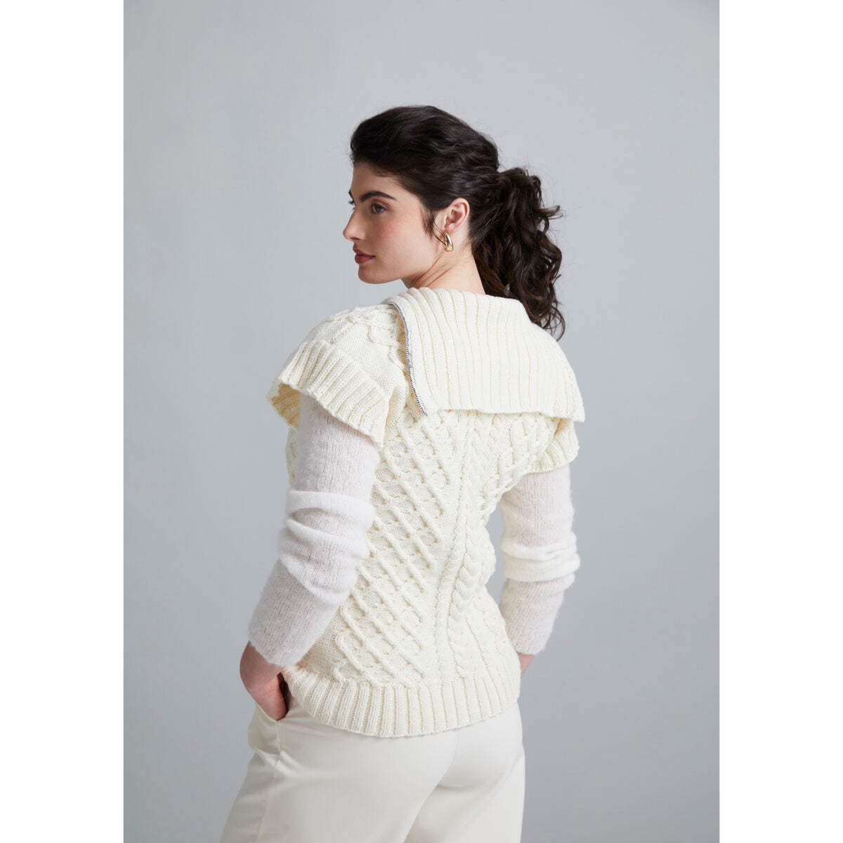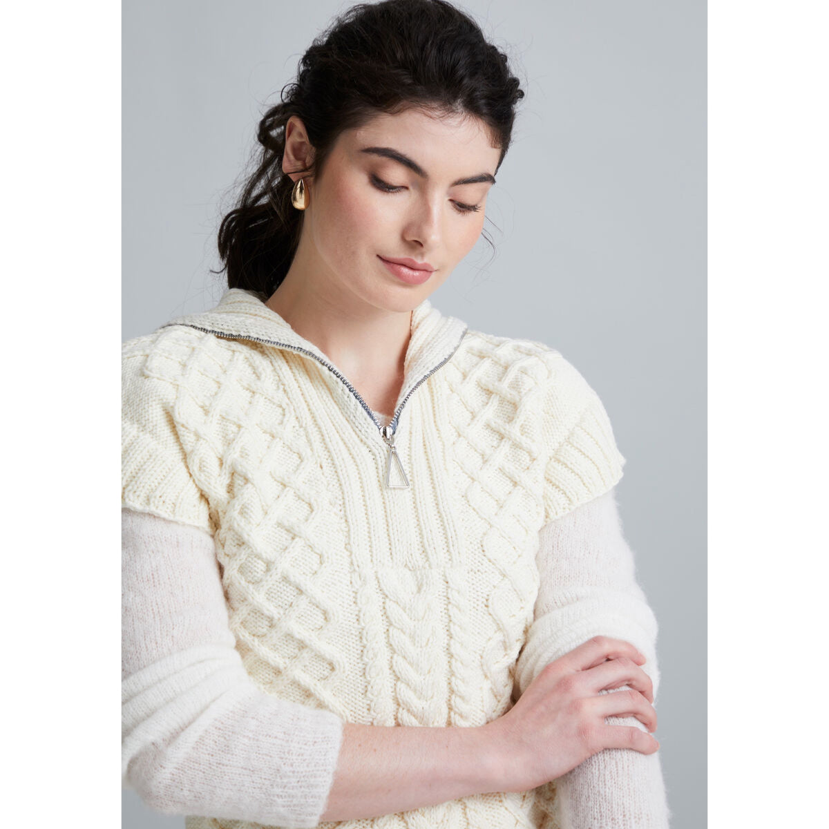 A modern cabled slipover knitted in Merino Soft, featuring short-row shaped cap sleeves and a zip-up high neck for added warmth and a contemporary edge. Wear it layered or on its own for effortless style and comfort.