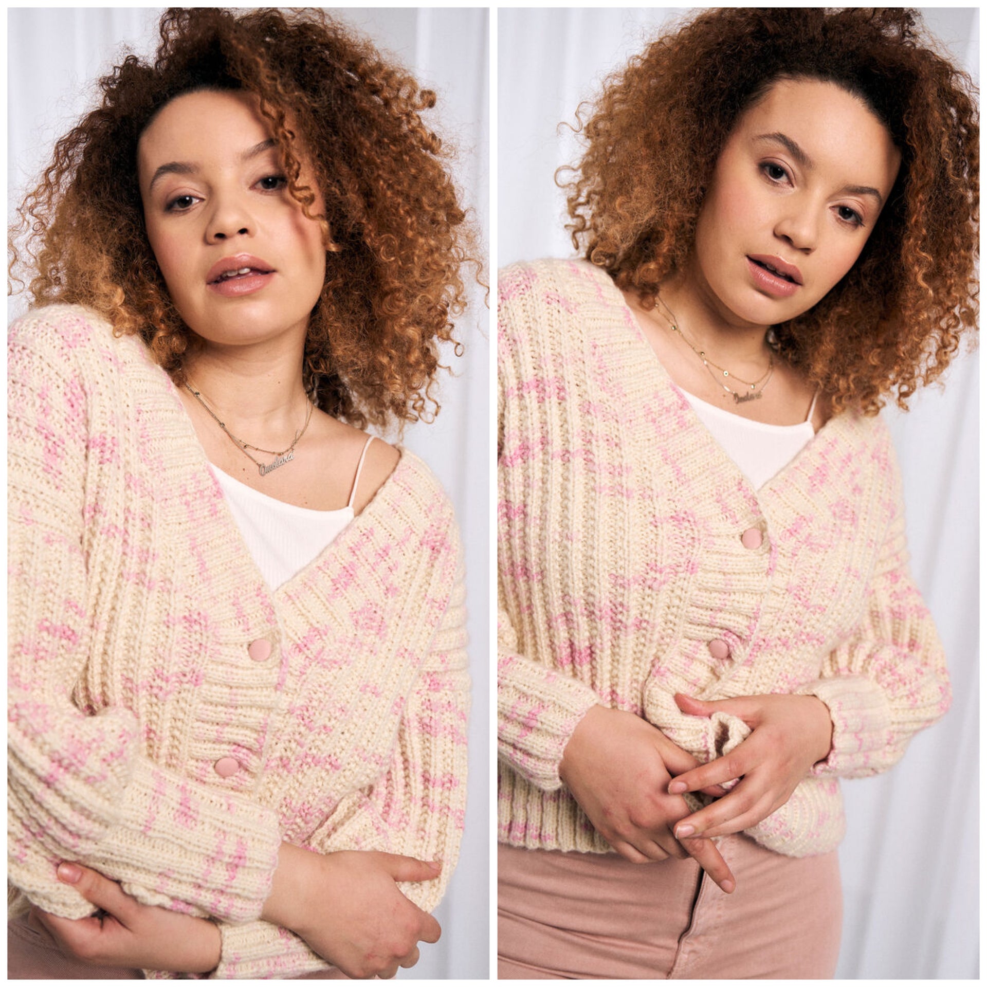 A V-neck cardigan with button fastening, knitted in a beautifully textured mistake rib stitch, Aries is a modern take on a classic. Featuring soft, balloon sleeves and a slightly cropped length, this wardrobe staple is crafted in Blush Pink from our Colourmix palette for a fresh, feminine feel.