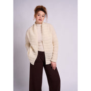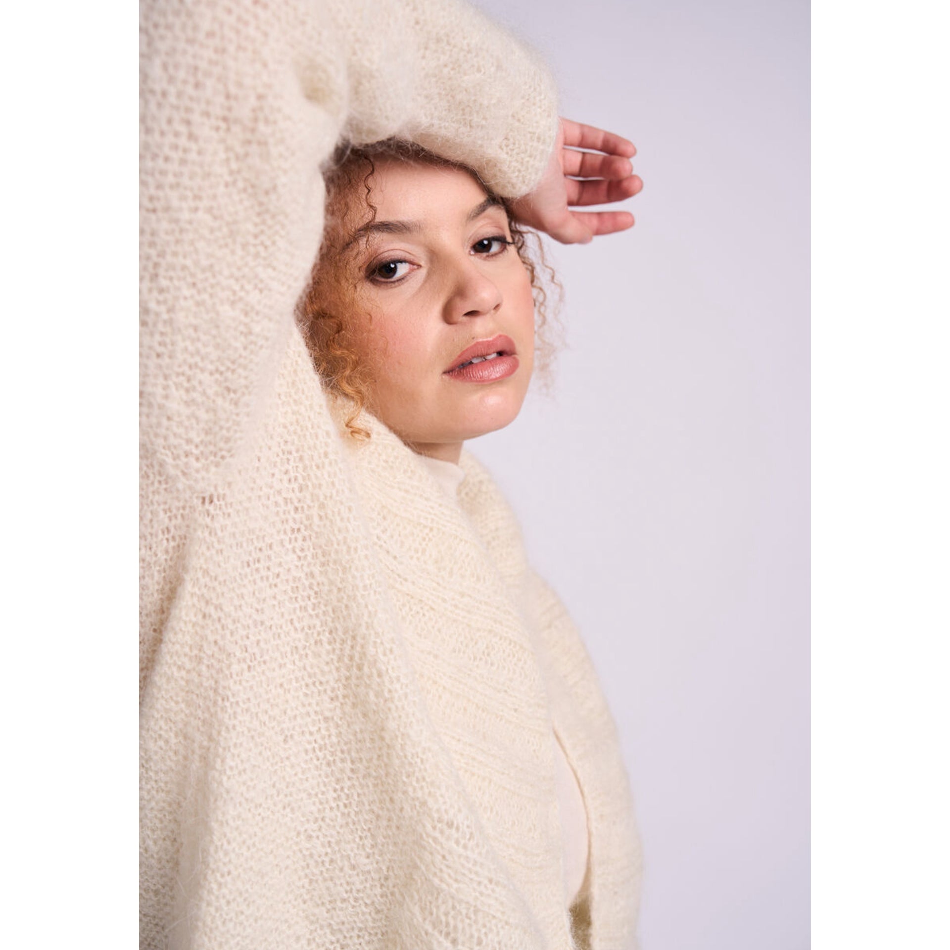Amalfi is a cardigan knitted top down with deep rib detailing on the front bands, flattering loose fit, knitted in reverse stocking stitch. Elegant, easy to wear piece.