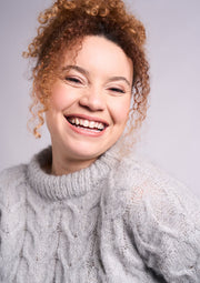 A beautiful all over cable knit sweater knitted in Mohair Soft. A crew neck band and a dropped sleve along with ribbed hems, cuff and neckband finish off this sweater.