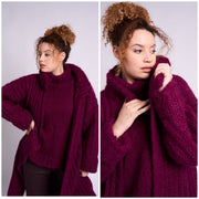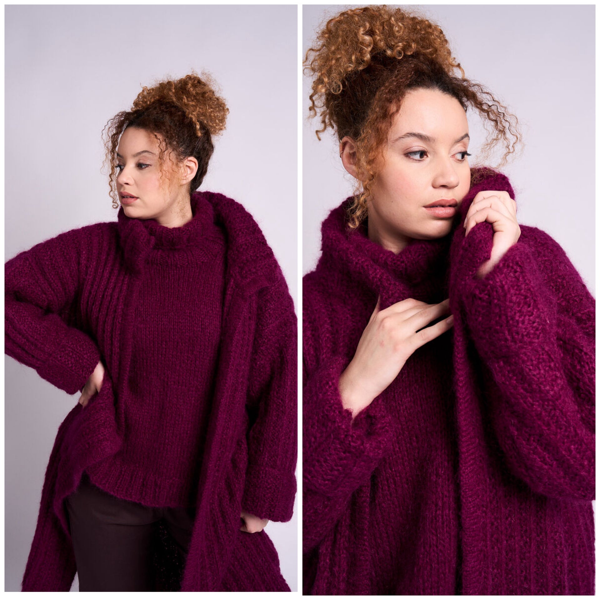 Long / full length cardigan, knit in mistake rib stitch, held double in mohair soft, simple shaping with turn back cuffs and stand up collar make this piece right on trend