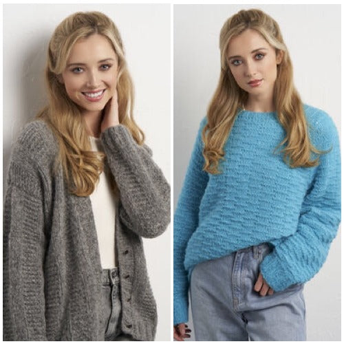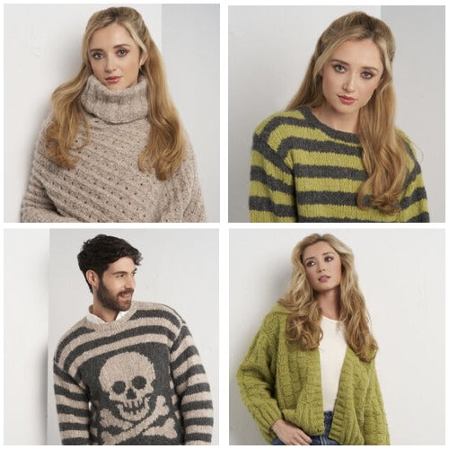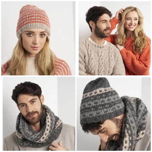 Easy Fleece Style designed by Martin Storey by Quill Studios, In Brushed Fleece Textured scarves, fairisle scarves, skull sweater, cabled scarf, scarft and snow cap matching