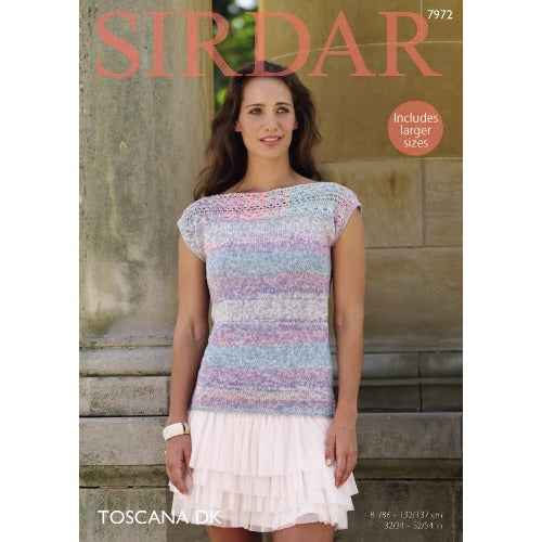 Toscana DK top worked in leaf lace patterns with ribbed bottom edge and boatneck style.