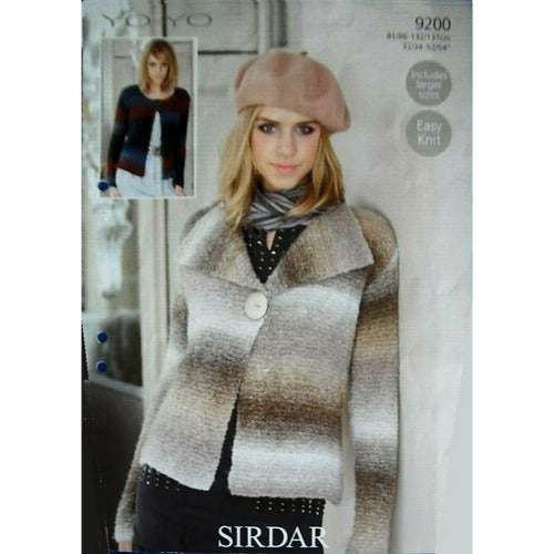 Jacket with one button closure. Simple fold over collar and dropped sleeves. A very easy knit.