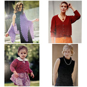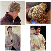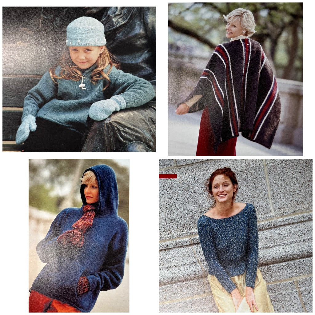Featured patterns: includes youth to adults: socks, winter hats and mitts, collared wrap shawls, cardigans, coats, tops, serape, vests, hoodies,