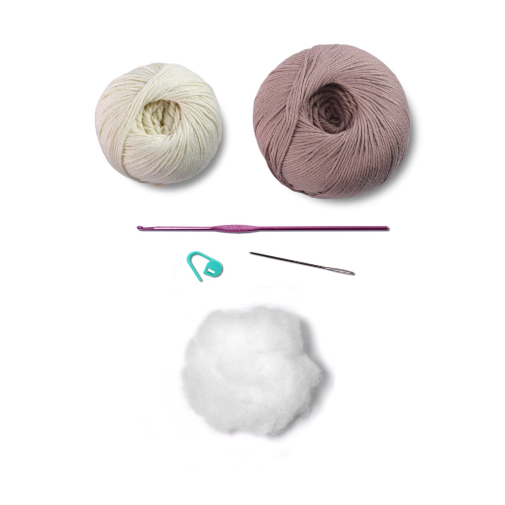 Cotton Kit includes: 2.5mm crochet hook, 2 balls of cotton yarn, 1 skein of cotton, stuffing, 1 locking stitch marker, and tapestry needle.