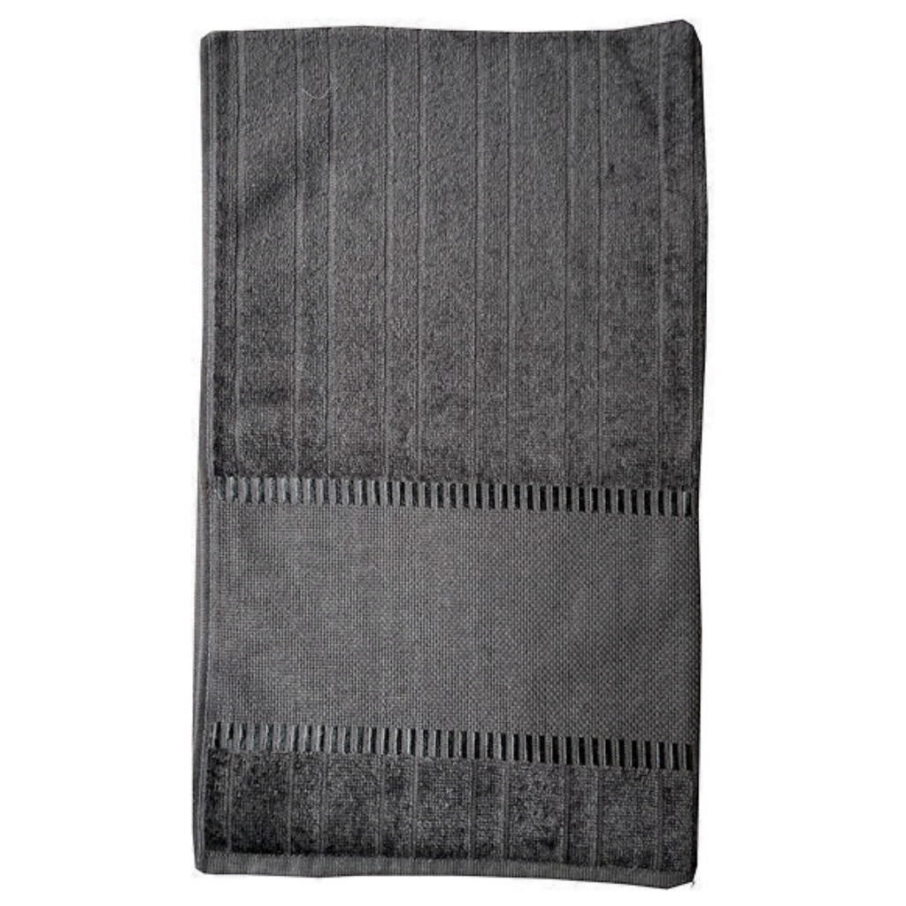 Bella Hand towel - Black 85%cotton, 15% viscose velour hand towel The cross stitch border area is generous 4 1/4" wide. Pretty, decorative border is trimmed with vertical satin bars that will highlight your stitching.