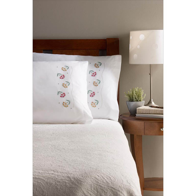 Daisy Bouquet Pillowcase Pair Bunches of daisy dancing across the pillowcase Two stamped embroidery pillowcases (40% polyester, 60% cotton) Instructions included. Floss not included