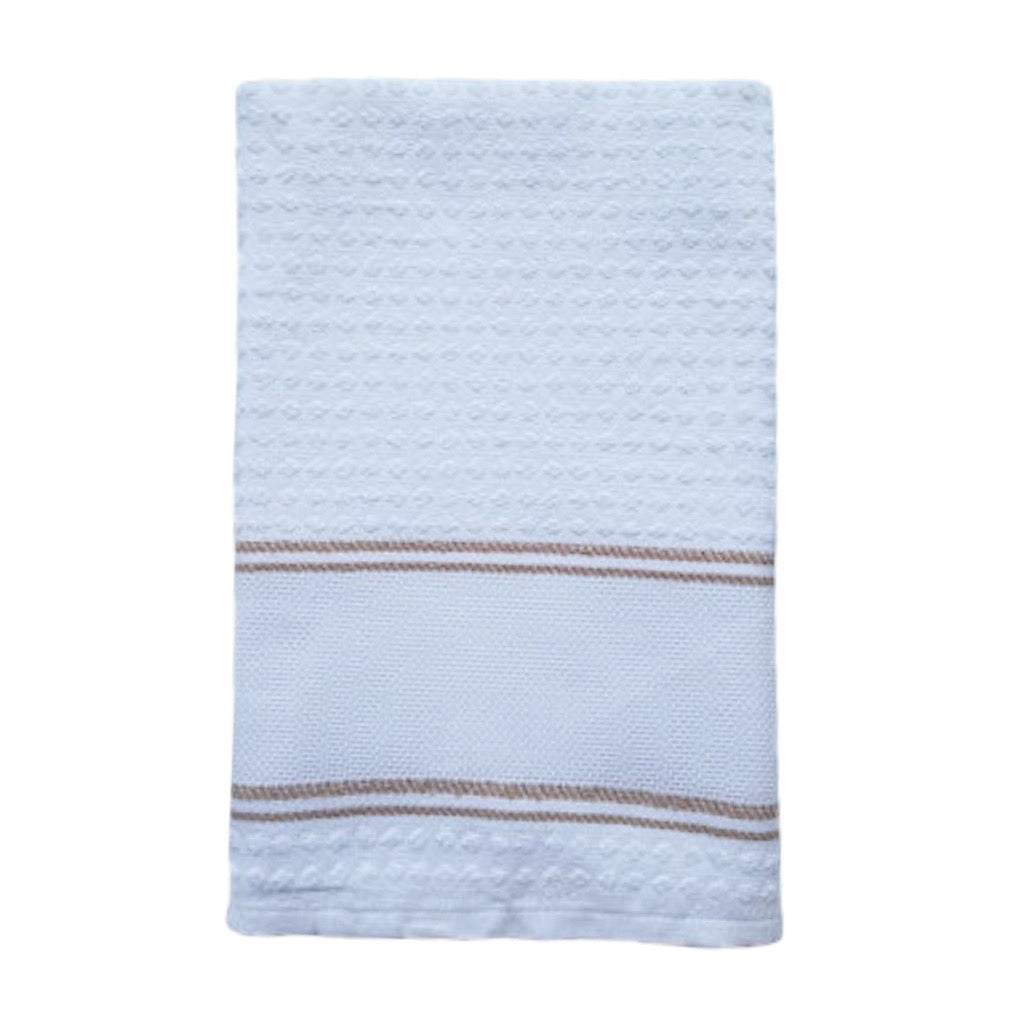 This 100% cotton nubby terry kitchen towel measures 15" x 24" with a 2 3/4" woven band of 14ct that is brightly accented with a double stripe of color above and below the stitching area. *