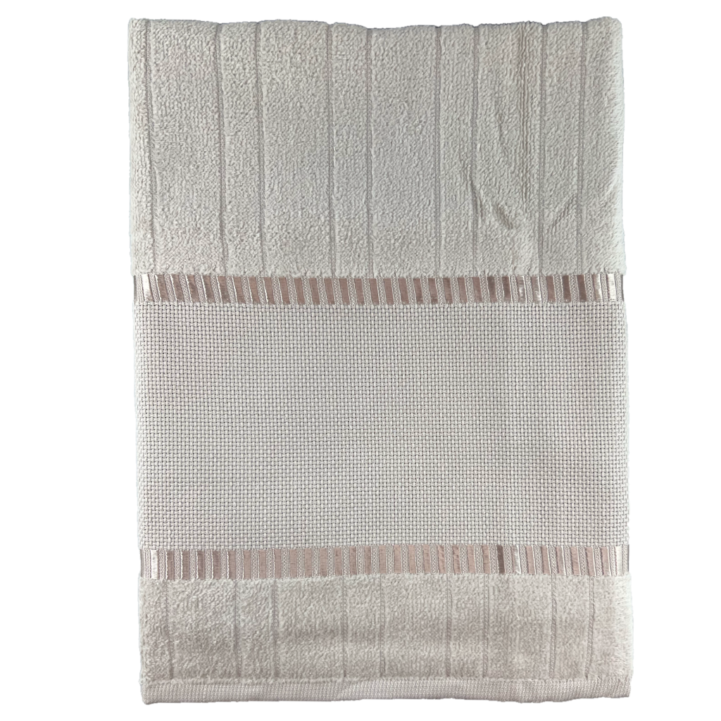 Bella Hand towel - Grey 85% cotton, 15% viscose velour hand towel The cross stitch border area is generous 4 1/4" wide. Pretty, decorative border is trimmed with vertical satin bars that will highlight your stitching.