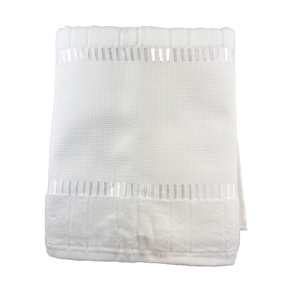 Bella Hand Towel - White Velour with vertical satin edging on each side of stitching area.