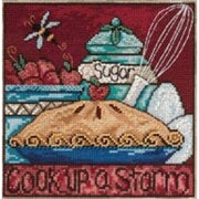 Bright colors depict a baked pie, sugar bowl and wire whisk. Bake up a storm for sure