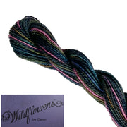 This thread has a matte finish once used, and weighs between a #8 and #12 pearl cotton thread.