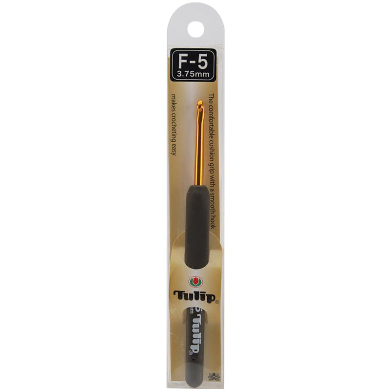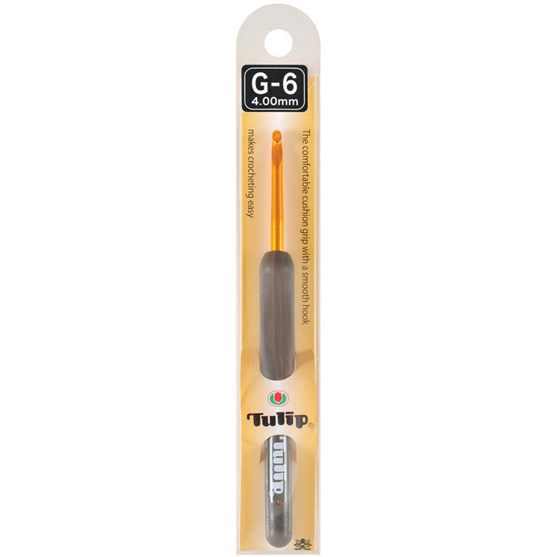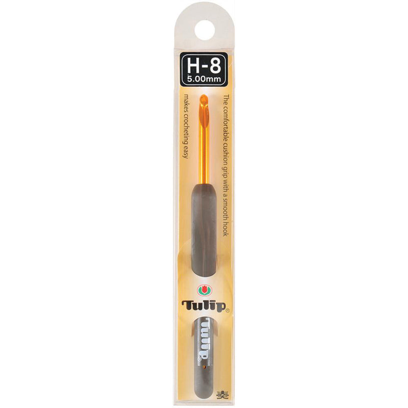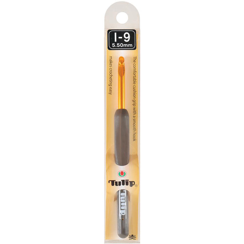 The first crochet hook from the Etimo series has a grey cushion grip. This helps users hold it without undue stress