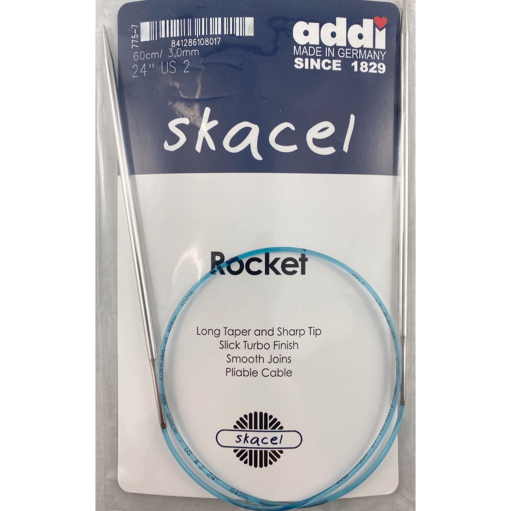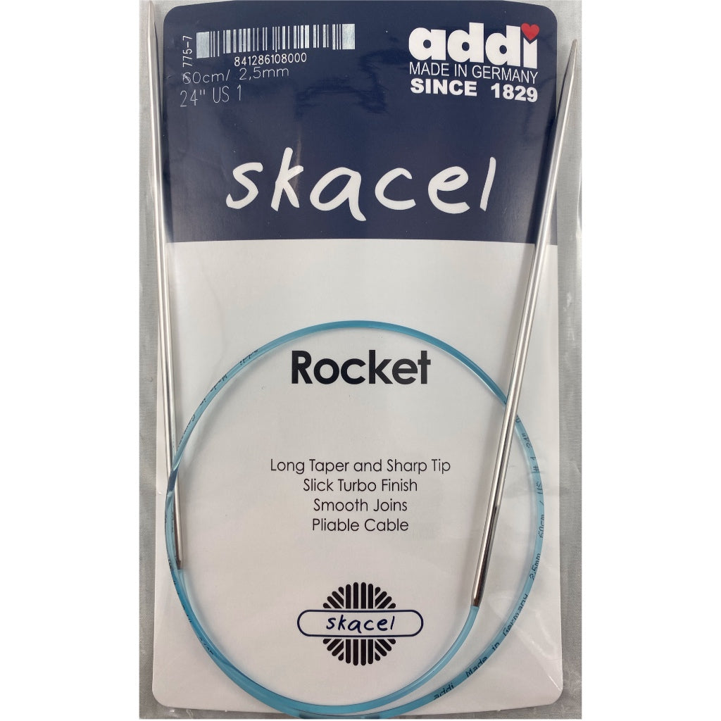 The addi Rocket extra-pointy tips feature nickel plating that gives the classic addi its incomparable zip. The smooth join between the needle and cord gives a wonderful glide to your yarn, making knitting that much easier and quicker.