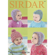 Sirdar Leaflet - 4771 Snuggly Rascal DK Baby Hats with designs in lace edge bonnet, helmet, ribbed hat. Sizes: Birth to 2 years Yarn Used: 1 ball (50g) Leaf Lace Bonnet and Helmet need 1 button. Shell Edged Bonnet need 1m of Satin ribbon.