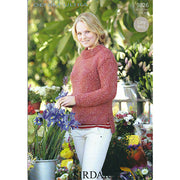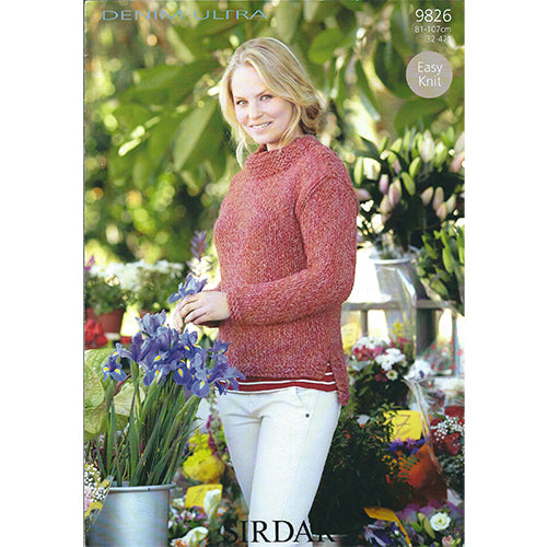 Sirdar 9826 working with Super Chunky yarn creates long sleeves sweater wih drop shoulder and garter stitch neckline. Elongated back.