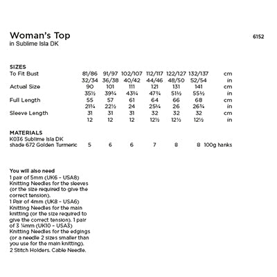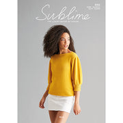 Sublime - Ladies Boat neck sweater with puffy sleeves and cabled cuffs Sizes: 32 to 54 (81 to 137cm) Yarn: 5 to 8/100gram