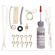 Ashford Spinning Wheel Maintenance Kit includes oil with thin spout, hooks and tape, tension springs, flyer hooks, flexible con rod joint, leather con rod joint, nylon retaining washer, brake band and drive band. .