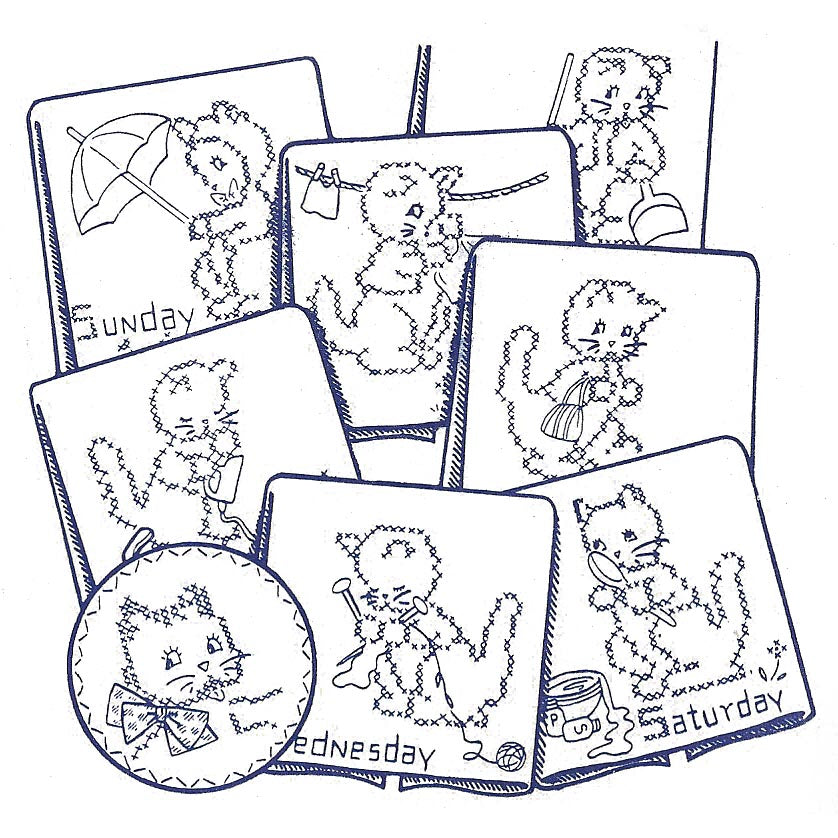 Aunt Marthas Hot iron transfers featuring Kitten in Cross Stitch, AM3502, activities such as knitting, wash day, split milk, etc.