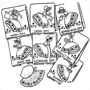 Aunt Marthas Hot iron transfers featuring Colonial girl in era dress working her daily duties in Colonial Girl Tea Towel Motifs, AM3553, to transfer with your iron, stitch or needlepaint and enjoy.