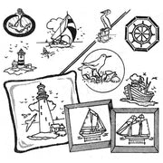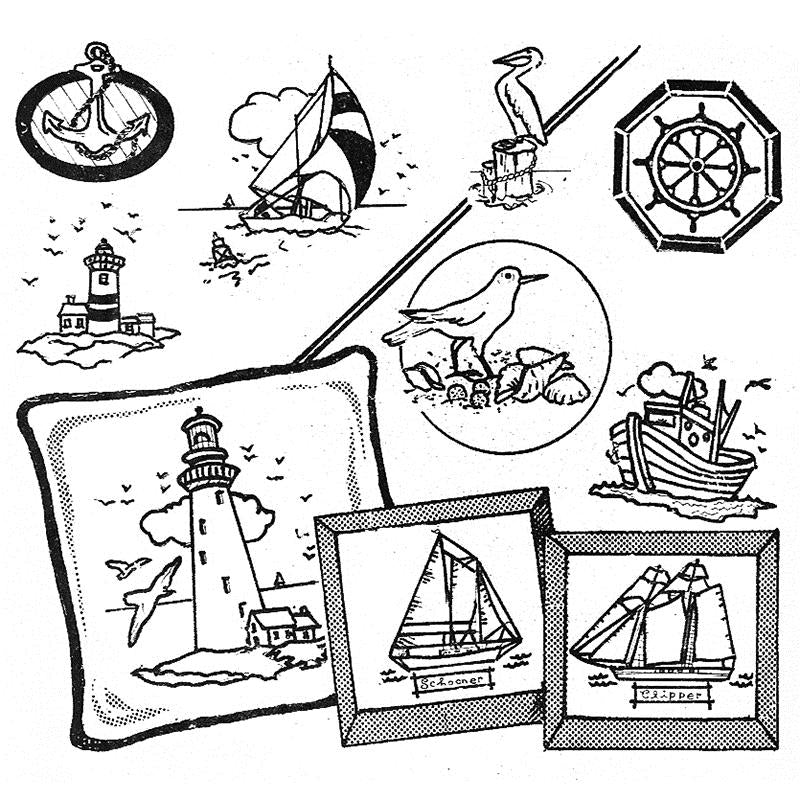 Aunt Marthas Hot iron transfers featuring Costal Marine, AM3918. Transfer images depicting the a waterfront scene: seagull, pelican, lighthouse, ships, boats, etc.. To transfer with your iron, stitch or needlepaint and enjoy.