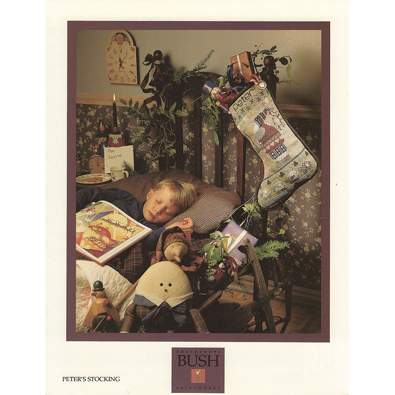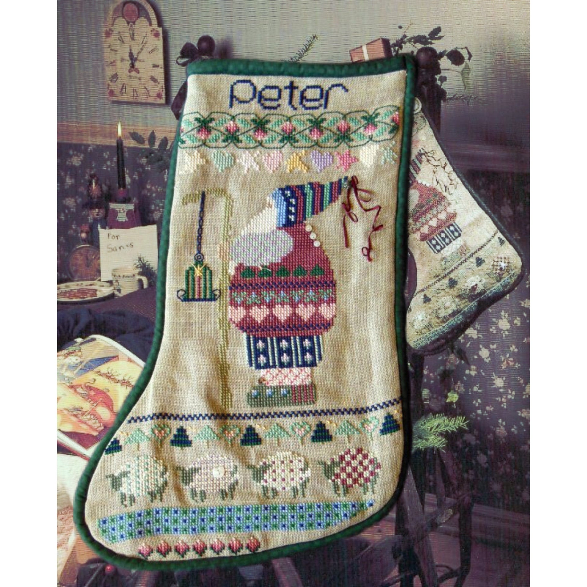 Worked in DMC Perle Cotton #5. The stocking is embellished with fabulous buttons and charms. For ease, purchase Peters charm pack.