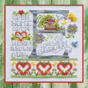 Pattern of the Month PM1704 March 2020 Home makes a Houses - Spring Home Banner E with watering cans and f birds and flowers.