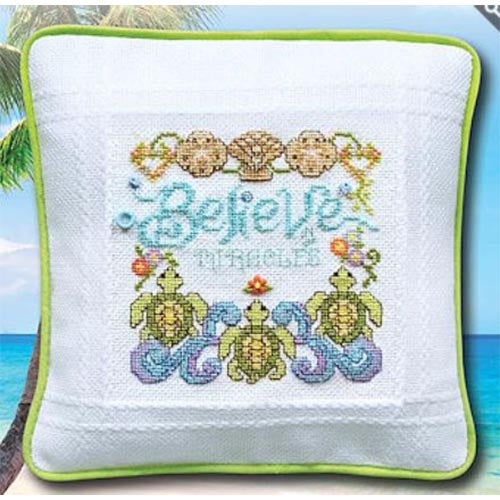 Stoney Creek Pattern of the Month Series for April 2021. Three Turtles and a shell border, with text 'Believe in Miracles'. Tropical Spirit 4 of 4.