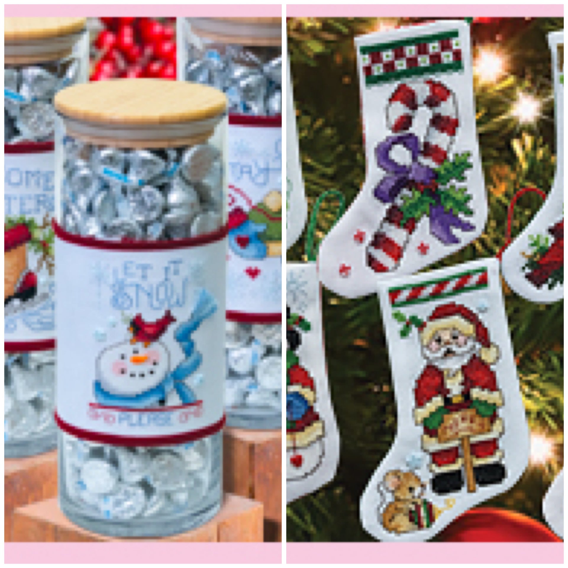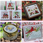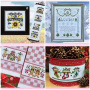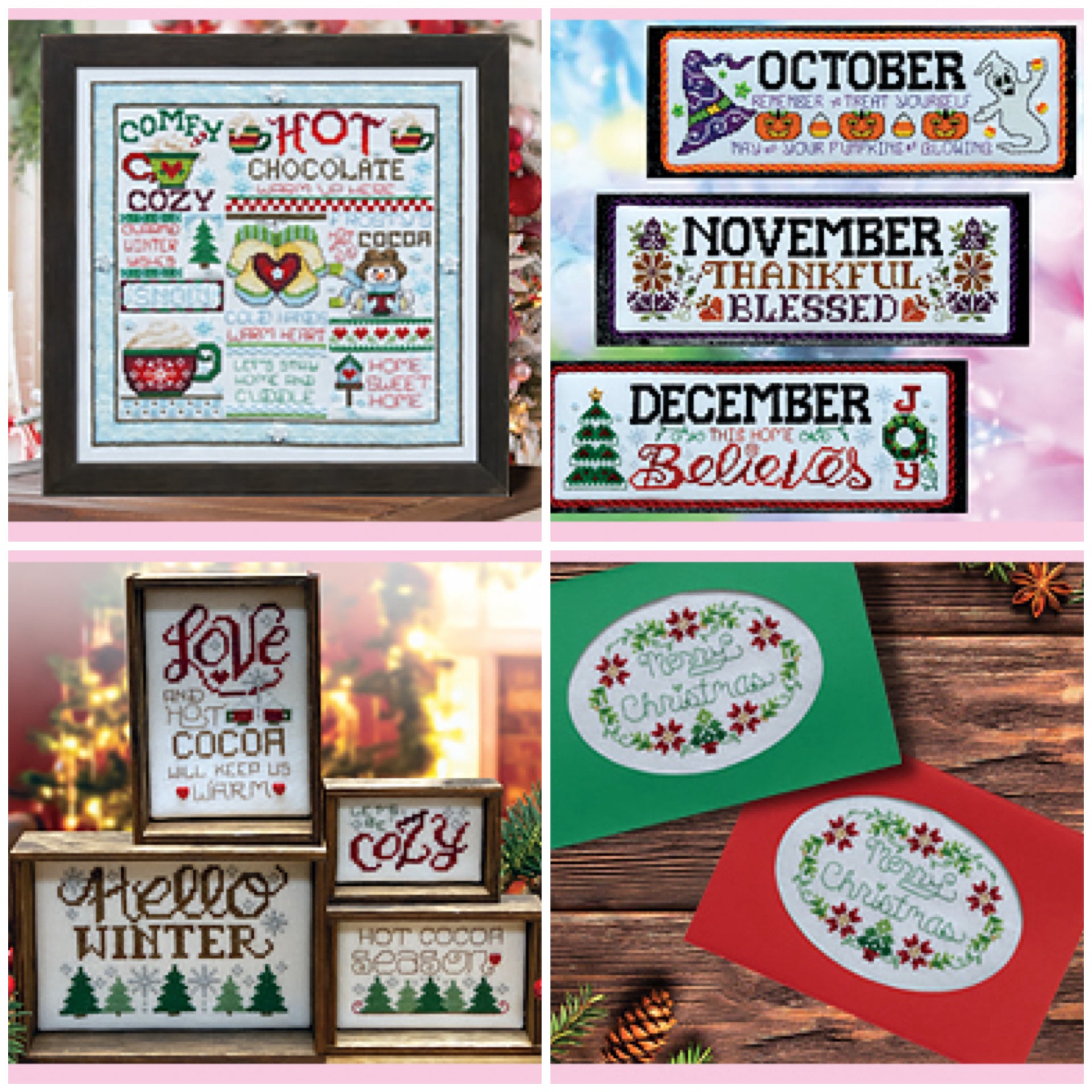 Countdown To Christmas, Close To My Heart, Wings of Hope, Peace Cardinals, Merry Christmas Cards, Hot Chocolate Sampler, Monthly Block Series - Oct/Nov/Dec, Love and Cocoa, Bee The Sunshine, Winter Sampler, Gingerbread Towels, Tiny Stockings Banner, Winter Jar Set, and Mini Stockings