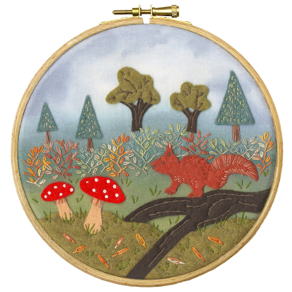 A Woodland Walk - Squirrel is felt embroidered. Squirrel on branch with woodland scene i background. Piece uses a variety of stitches and felt pieces Original Artwork by Bothy Threads