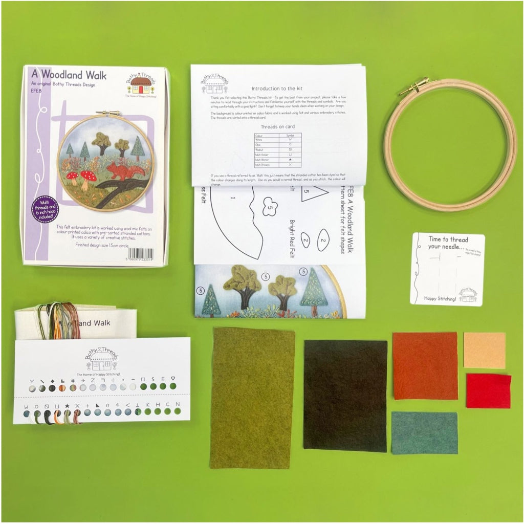 This kit contains: Color printed design with wool felt pieces and backing calico with pre-sorted stranded cottons, needle, and instructions and 6 inch embroidery hoop.